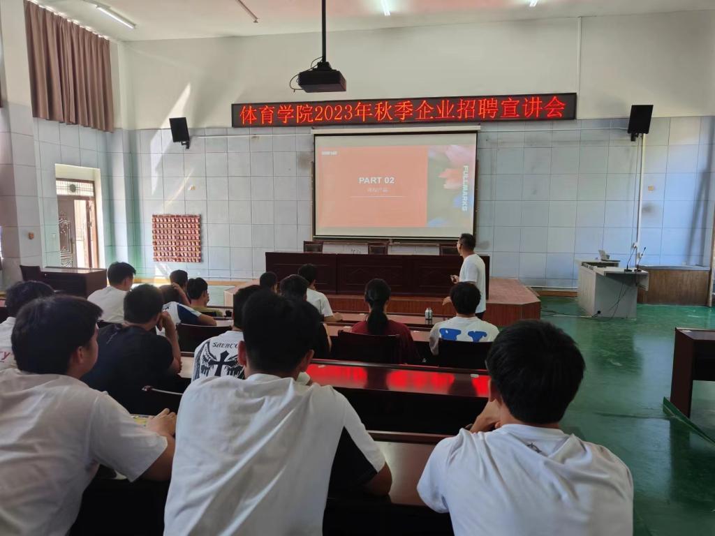 开学第一周,即9月5日下午,海角社交网页版邀请浙江省体育龙头企业----宁波满分体育发展有限公司,来体院开展秋季招聘宣讲会,会议由院党委副书记邓坤臣主持,2024届全体在校学生参加会议。