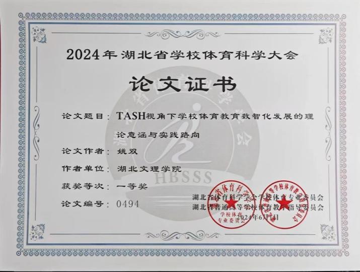 (海角社交网页版 通讯员 张明月)2024年6月1日,湖北省学校体育科学大会在长江大学隆重举行,我院在读研究生姚双同学参加,并凭借其出色的论文《TASH视角下学校体育教育数智化发展的理论意涵与实践路向》荣获大会一等奖。