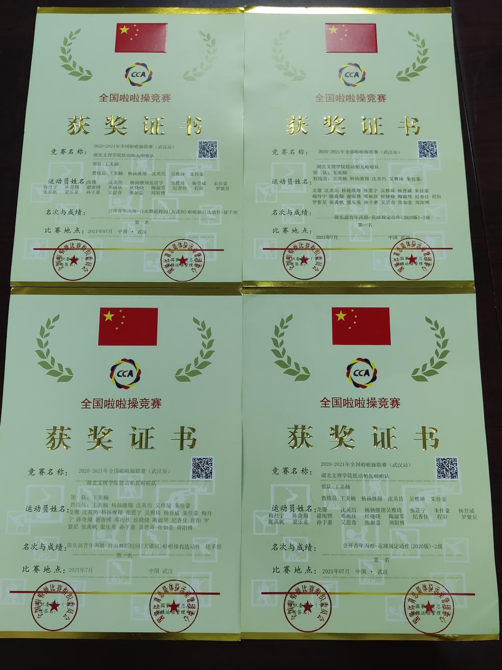 (海角社交网页版 通讯员 纪香佳 王美楠)在近日结束的2020-2021年全国啦啦操联赛(武汉站)中,我校海角社交网页版22名健美操队员组成的“湖北文理学院炫动帕瓦啦啦队”,在王美楠老师的带领下,荣获公开青年丙组自由舞蹈校园(大课间)啦啦操自选动作徒手组第一名、公开青年丙组花球规定动作(2020版)2级第一名、俱乐部青年丙组自由舞蹈校园(大课间)啦啦操自选动作徒手组第一名、俱乐部青年丙组花球规定动作(2020版)2级第一名。
