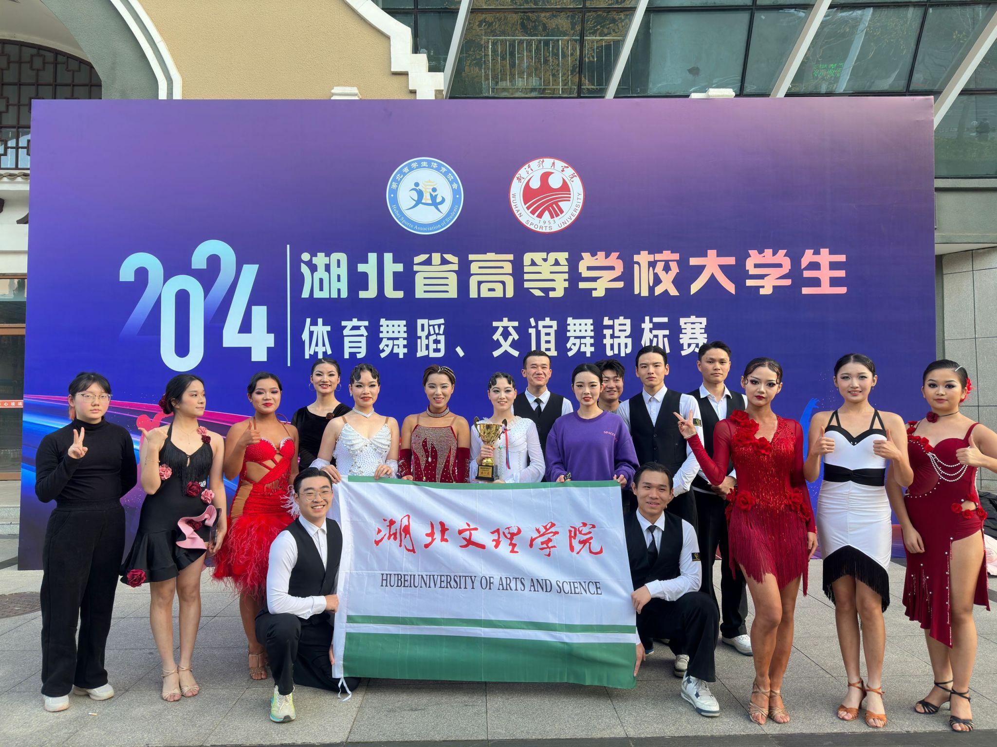 体育舞蹈校队由主教练林万雷和康吉提带领24名同学参加了乙组专业组7个项目的激烈角逐,最终获得4金1银1铜,分别是交谊舞摩登类团体舞第一名,全能乙组第一名,交谊舞拉丁类全能第一名,交谊舞摩登类全能第一、第二、第三和第四的好成绩。此外,我校还获得最佳编排奖。