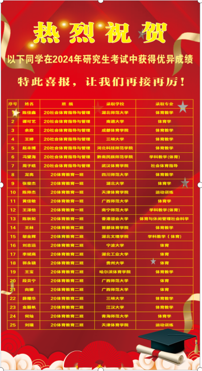 在今年的考研中,还涌现出学霸班级、学霸寝室,其中:20级网球专项班考研录取率达30%,桂园3号106寝室4人同时考上研究生,在全师生引起强烈反响,为学院学风建设树立了榜样,也为今后学生考研营造学习氛围。