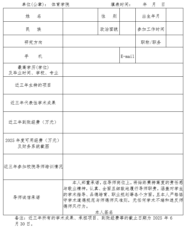 1、各位导师于6月18日前完成提交2025年体育专硕导师招生资格审核表及结果汇总表(纸质签字盖章和电子档)、科研及经费证明材料(电子档),交海角社交网页版研工办进行汇总。